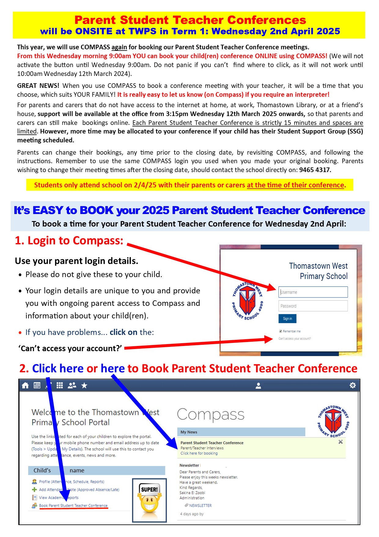 Please note that information has been included about our Term 1 Conferences in this newsletter. From this Wednesday morning 9:00am YOU can book your child(ren) conference ONLINE using COMPASS! (We will not activate the button until Wednesday 9:00am. Do not panic if you can’t find where to click, as it will not work until 9:00am Wednesday 12th March 2024).