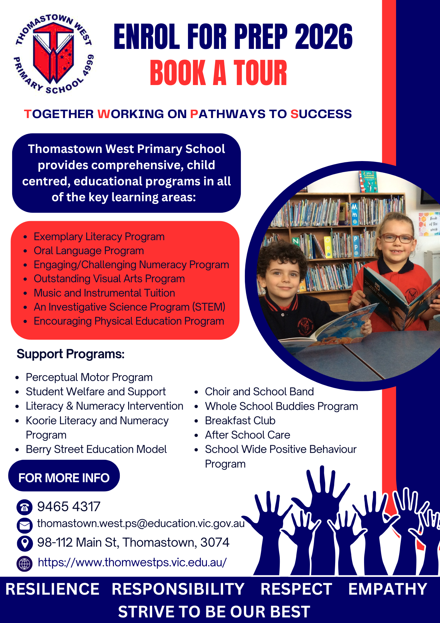 We warmly invite families to enrol their children for Prep in 2026 and begin their exciting learning journey with us. Our school provides a nurturing and engaging environment where every child is supported to thrive. To help you get to know our community and see our classrooms in action, school tours are available on Mondays and Fridays at 10:00am. Come and discover what makes our school a great place to learn, grow, and belong. We look forward to welcoming you!