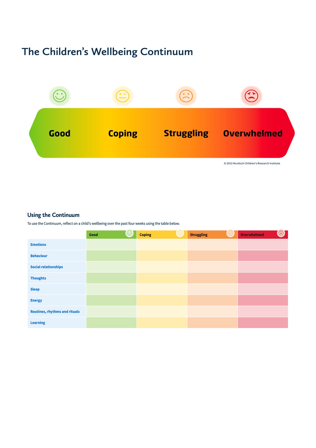One helpful tool is The Children’s Wellbeing Continuum. It offers a simple way to reflect on your child’s social-emotional wellbeing at any point in time. By helping to spot when a child might be struggling, it supports early conversations and actions—before problems become more serious.