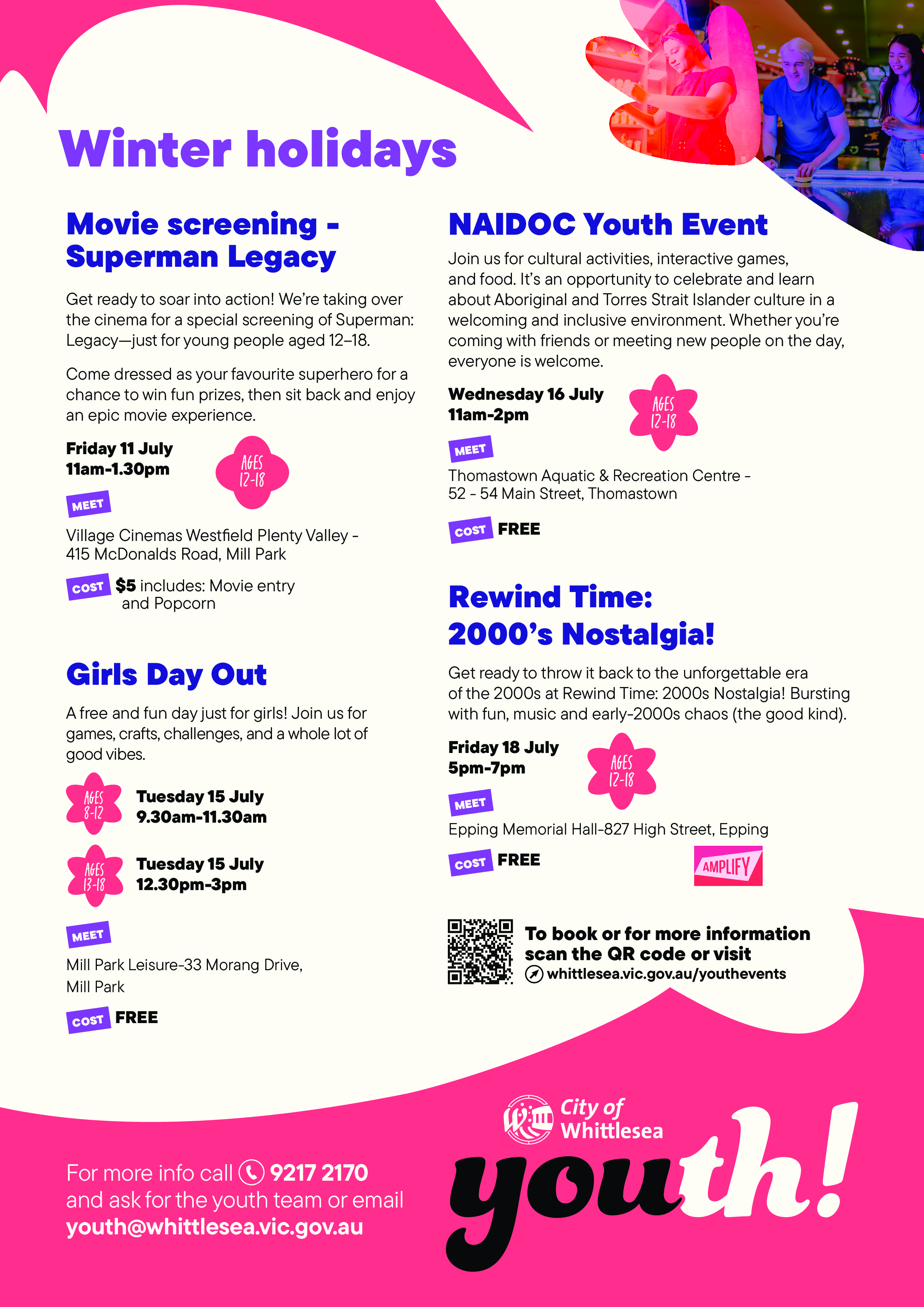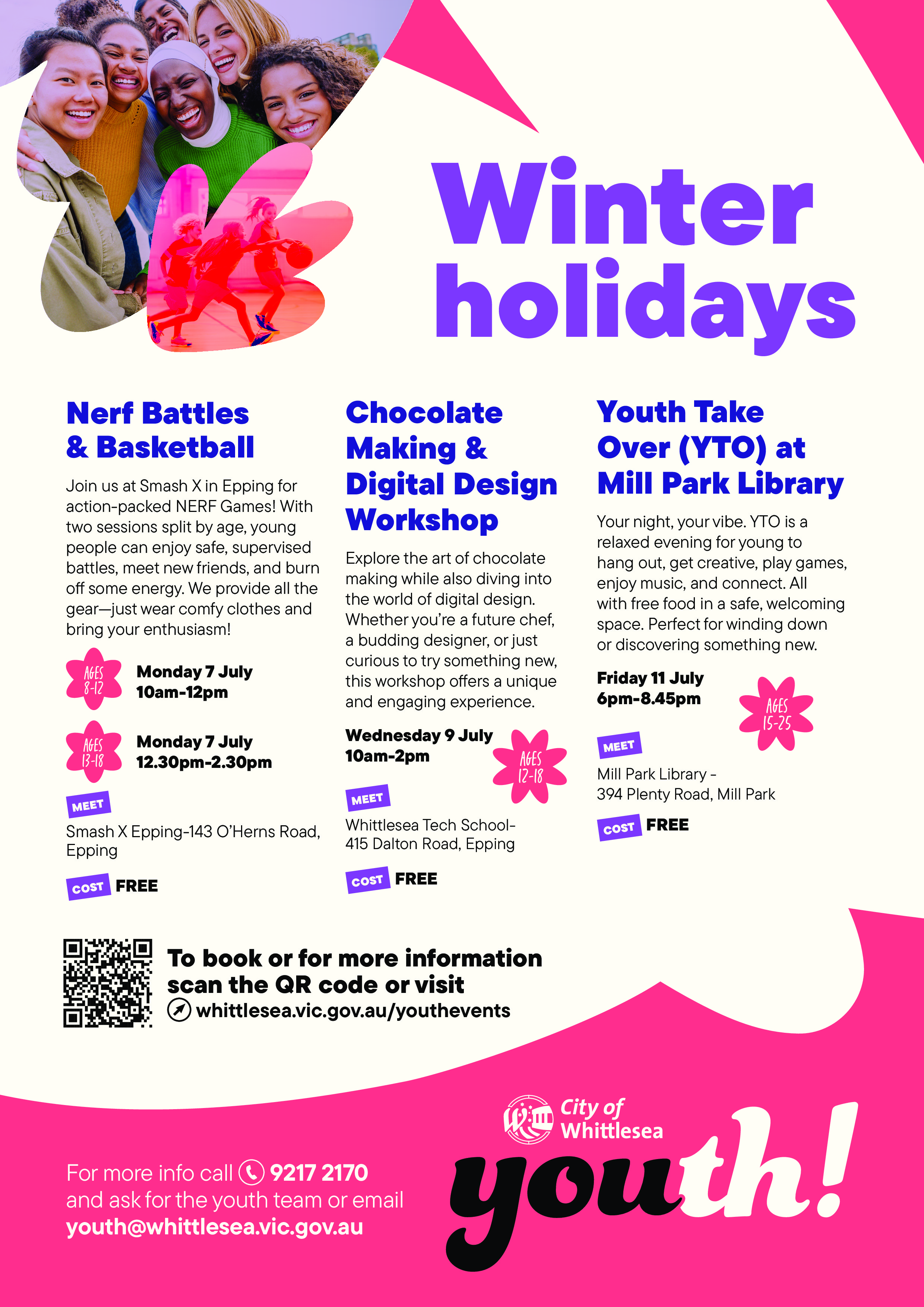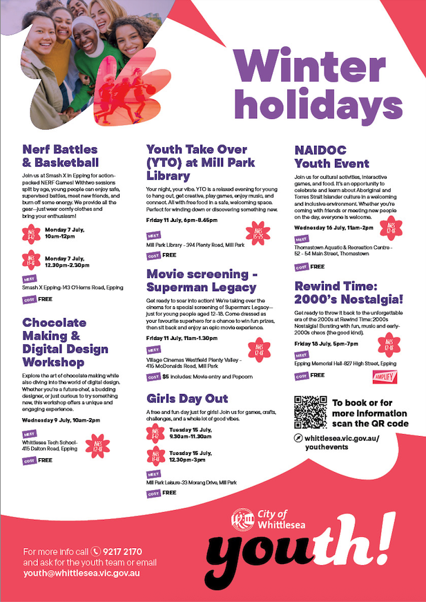 See the attached flyer for details on the range of activities being offered by the City of Whittlesea Youth Service across the winter school holidays.