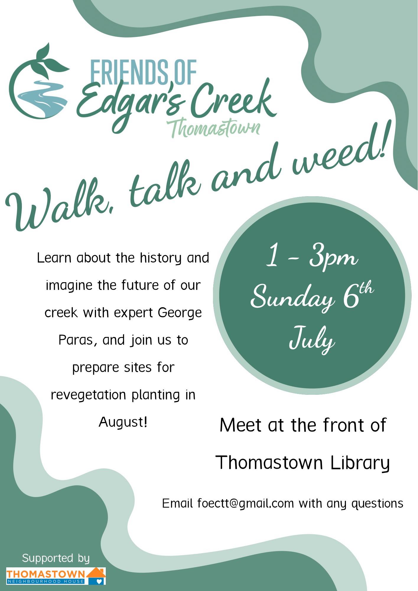 For more information check out the Friends of Edgar’s Creek Thomastown Facebook page Facebook Friends of Edgar's Creek Thomastown or via email at foectt@gmail.com__