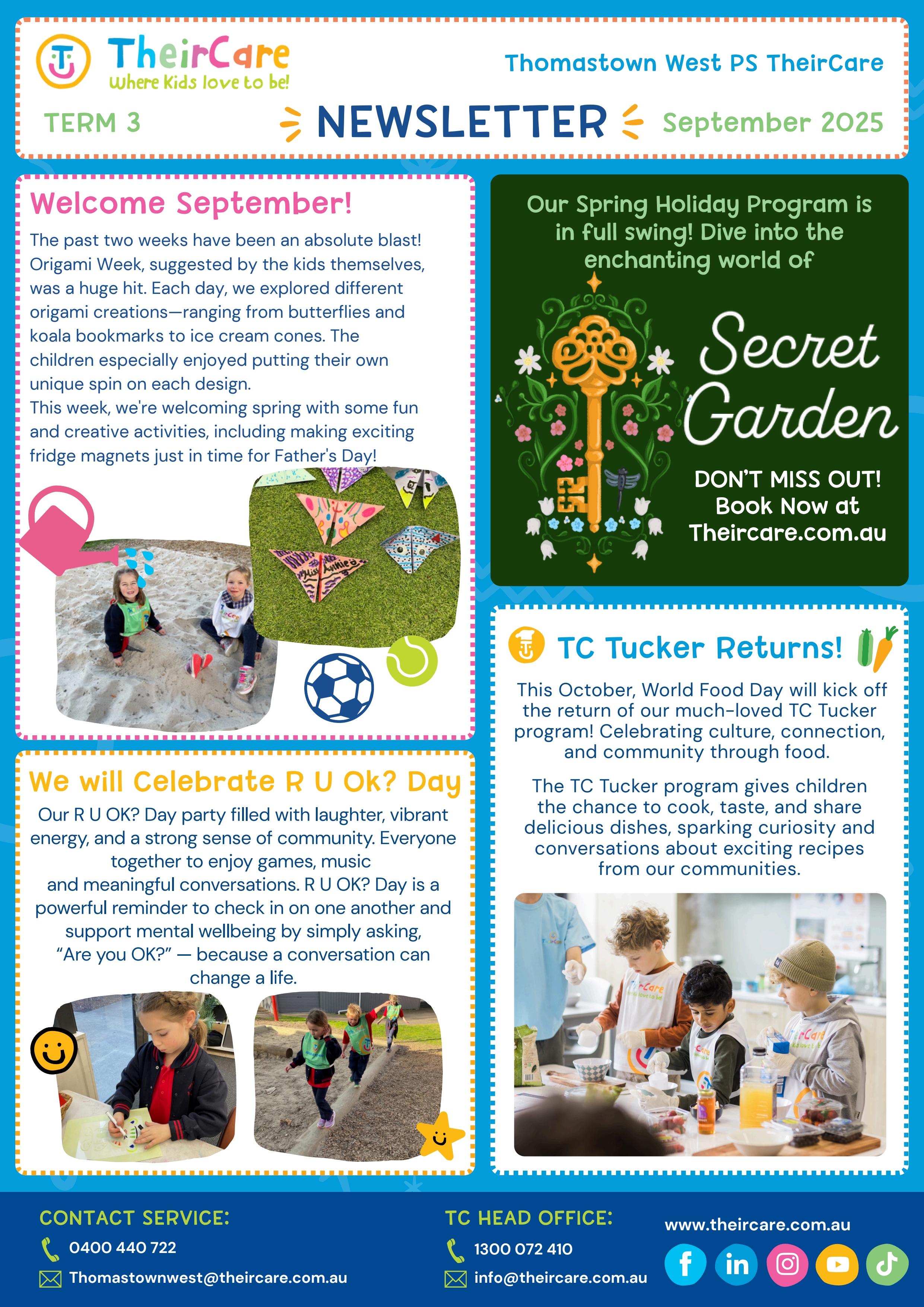 Footy Day Parade & Hot Lunch – We wrap up the term with our much-loved Footy Day! Students are invited to wear their team colours, join in the parade, and enjoy a hot lunch (available to order). Orders must be in by Friday 13th September.